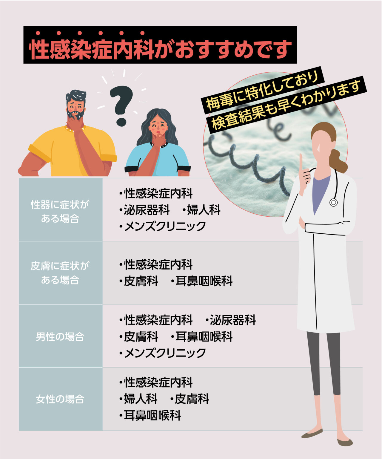 専門分野として梅毒に特化したクリニックで治療したいなら、検査結果も早くわかるので、性感染症内科がおすすめですよ。