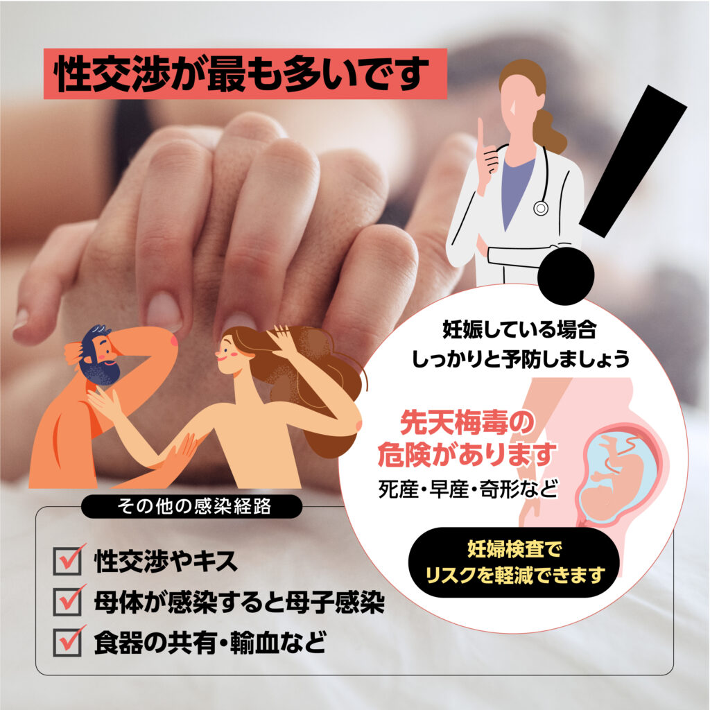 梅毒は、性行為による皮膚や粘膜の接触で感染します。