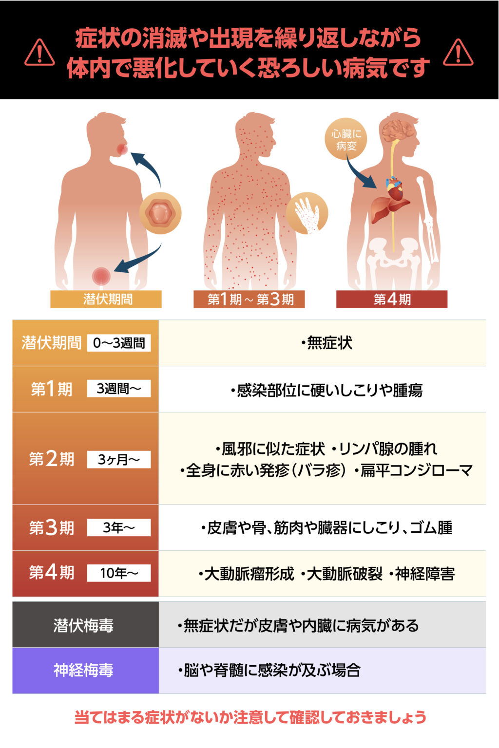 梅毒の怖いところは、症状が出ても一定期間が経過すると消滅し、症状の出現を繰り返しながら体内で病変が悪化していくところです。